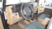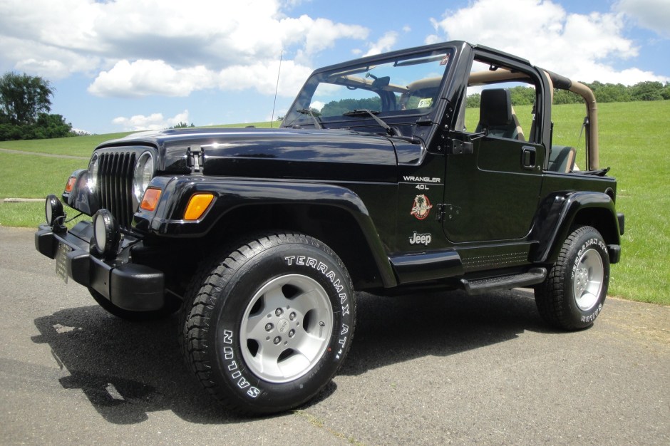 This 2000 Jeep Wrangler Sahara is finished in black over Dark Green and Camel cloth upholstery and is powered by a 4.0-liter inline-six linked with a three-speed automatic transmission and a dual-range Command-Trac transfer case. Features include a tan Quadratec soft top, full metal doors, 15″ Canyon aluminum wheels, a Rough Country steering stabilizer, fog lights, air conditioning, a fold-and-tumble rear seat, power steering, high-back front bucket seats, an AM/FM/CD stereo, and a roll bar.