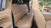 The cabin is upholstered in tan leather with a matching dashboard, carpets, and door panels. Equipment includes a fold-down center console, power windows and locks, air conditioning, power-adjustable and heated front seats, cruise control, an AM/FM stereo with cassette and CD players, an aftermarket backup camera, and an under-dash Draw-Tite trailer brake controller.
