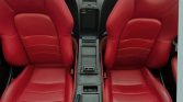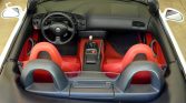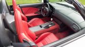 The cabin features seating surfaces upholstered in red leather with matching door panels, carpeting, and S2000-embroidered floor mats. Amenities include a four-speaker AM/FM/CD stereo, aluminum pedals, push-button start, power windows, power door locks, cruise control, and air conditioning.