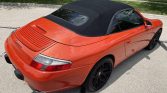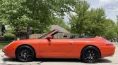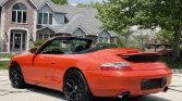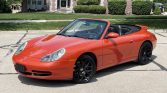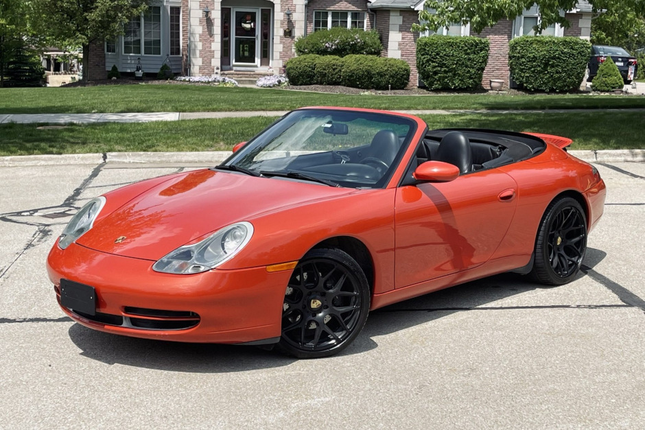 This 2001 Porsche 911 Carrera cabriolet is finished in Zanzibar Red over black leather and is powered by a 3.4-liter flat-six paired with a six-speed manual transaxle. Equipment includes a power-operated soft top, aftermarket 18″ wheels, xenon headlamps, stainless steel exhaust, power-adjustable seats, cruise control, automatic climate control, the Technic Package, and a JVC stereo with Bluetooth.