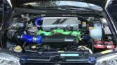 The 2.0-liter EJ20 flat-four is a JDM-spec replacement unit that was installed during current ownership and features a VF48 turbo, a Mishimoto top-mount intercooler, Grimmspeed electronic boost controller, and a Cobb short-ram intake. The timing belt has reportedly been changed, and the seller notes a recent oil change and reports that smoke emits from the exhaust when letting off the throttle. Additional modifications include the following: