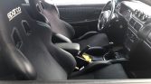 The cabin houses dual Sparco Torino 2 seats trimmed in black fabric and vinyl. 2.5RS-branded mats line the floors, and amenities include an aftermarket keyless entry and alarm system, air conditioning, an electric sunroof, power windows, and a Pioneer head unit equipped with a DVD player and Bluetooth connectivity and wired to JL Audio speakers, including 8″ subwoofers in the door panels. A Cobb Accessport flash tuner is mounted to the driver’s left, and reportedly contains maps for both 93 octane and E85 Ethanol.