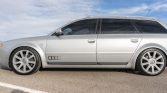 Silver 18″ RS6 wheels feature Audi center caps and are mounted with 235/40 Continental ExtremeContact DWS tires that show 2021 date codes. The suspension has been modified with H&R coilovers, and stopping power is provided by four-wheel disc brakes with multi-piston front calipers.