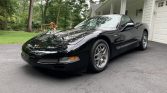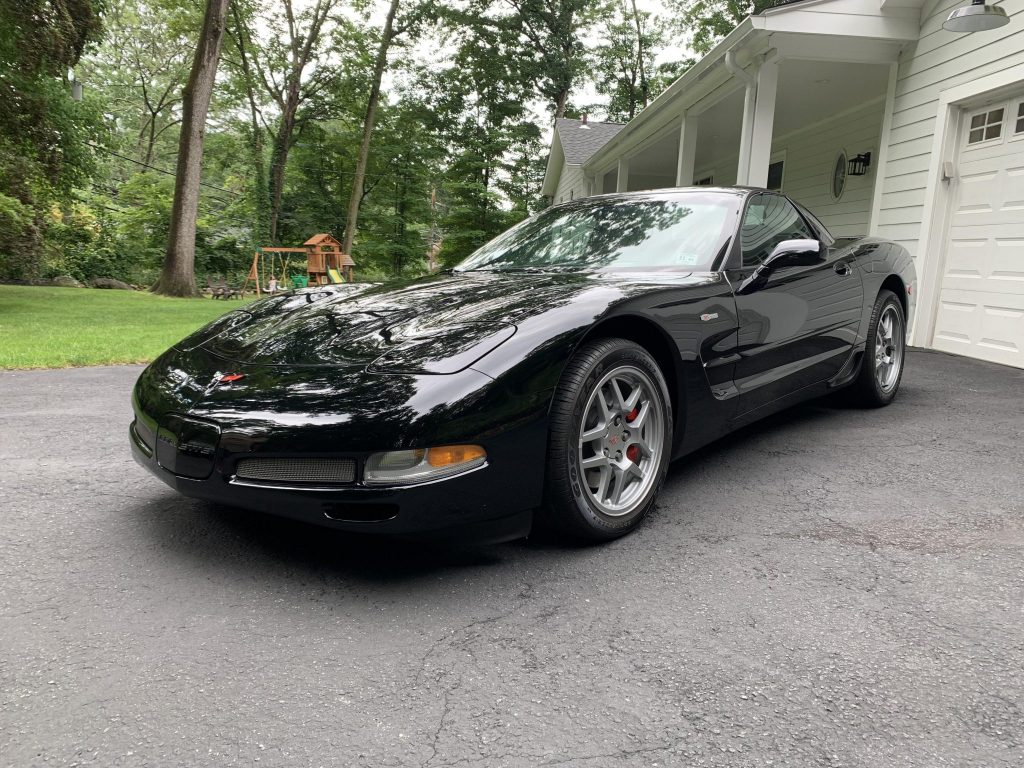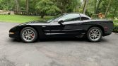 This 2002 Chevrolet Corvette Z06 is finished in black over matching leather and powered by a 5.7-liter LS6 V8 mated to a six-speed manual transaxle and a limited-slip differential. The car was first registered in New Jersey and was acquired by the seller’s father in January 2021, reportedly from its original owner. Equipment includes 17″ and 18″ aluminum wheels, brake cooling ducts, a head-up display, dual-zone automatic climate control, and a Bose audio system.