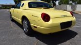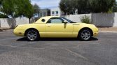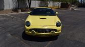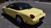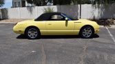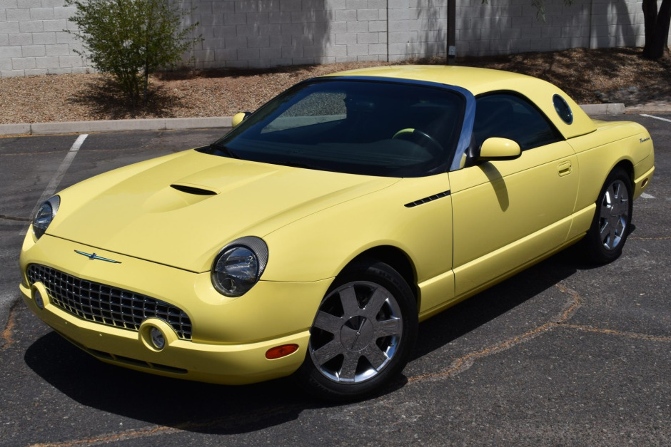 This 2002 Ford Thunderbird is finished in Inspiration Yellow over black and yellow leather and is powered by a 3.9-liter V8 paired with a five-speed automatic transmission. Equipment includes a black convertible top, a body-color removable hardtop, chrome 17″ wheels, dual-zone automatic climate control, power-adjustable seats, and a CD stereo.