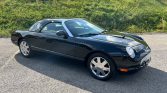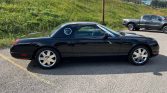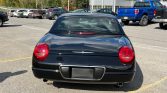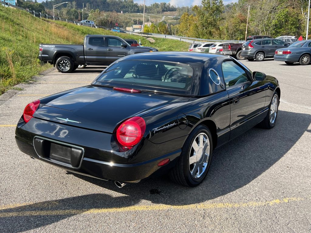 This 2002 Ford Thunderbird was recently acquired by the seller from the original owner and is finished in Evening Black over black leather. Power is supplied by a 3.9-liter V8 paired with a five-speed automatic transmission, and equipment includes a removable hardtop, a black soft top, a convertible top boot, an in-dash six-CD changer, dual-zone automatic climate control, power-adjustable seats, integrated fog lights, and chrome 17″ wheels.