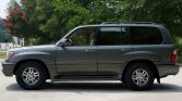 This 2002 Lexus LX470 was initially delivered to Lexus of Memphis, Tennessee, and spent time in Raleigh, North Carolina, before being acquired by the seller in May 2021. The truck is finished in Riverock Green Mica over ivory leather and is powered by a 4.7-liter 2UZ-FE V8 paired with a four-speed automatic transmission, a dual-range transfer case, and a locking center differential. Additional features include Adaptive Variable Suspension, Adjustable Height Control, fog lights, third-row seating, and power-adjustable and heated front seats.