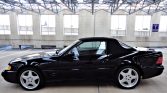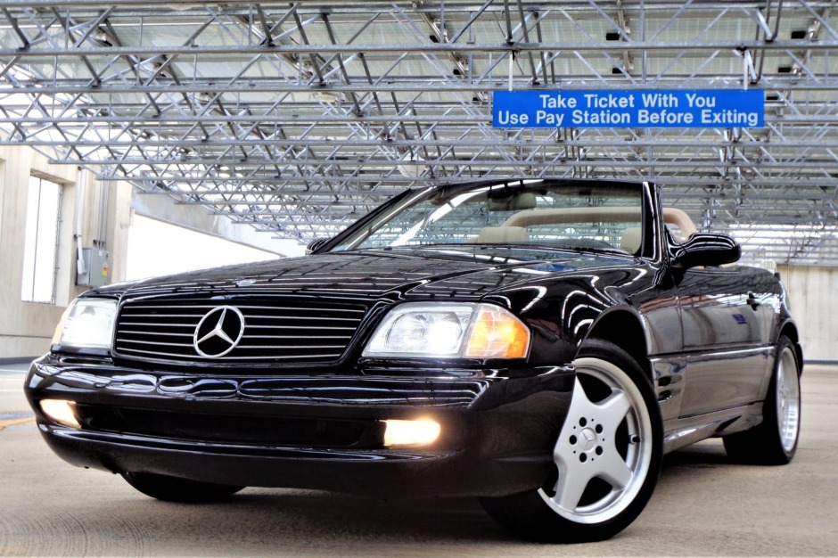 This 2002 Mercedes-Benz SL500 is powered by a 5.0-liter V8 paired with a five-speed automatic transmission and finished in black over tan leather. Equipment includes a power-operated black soft top, a body-color removable hardtop, the AMG Styling Package, 18″ AMG wheels, heated and power-adjustable seats with memory, automatic climate control, burl walnut interior trim, and a trunk-mounted CD changer. The car spent time in Maryland and Florida before being acquired by the seller in July 2021.