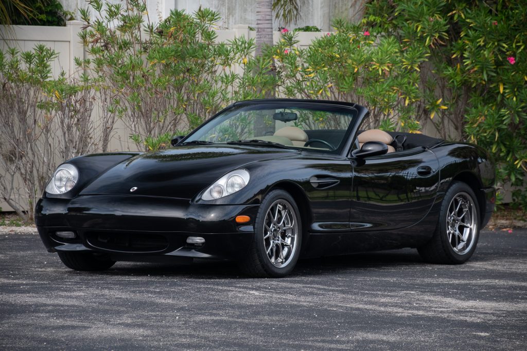 This 2002 Panoz Esperante is a black-over tan convertible that is powered by a hand-assembled 4.6-liter Ford DOHC V8 mated to a five-speed manual transmission and a limited-slip differential. Equipment includes a power-retractable black convertible top, carbon-fiber interior trim, a power-adjustable driver’s seat, traction control, a carbon-fiber engine cover, four-wheel independent suspension, and optional chrome-finished 18″ BBS wheels. The car spent time in Florida and Georgia before it was acquired by the seller in June 2021, and…
