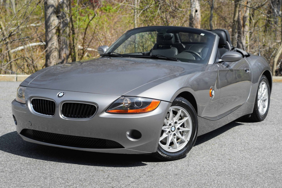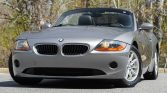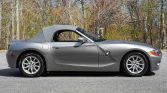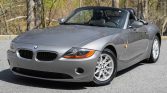 This 2003 BMW Z4 Roadster is finished in silver with a gray convertible top, and it is powered by a 2.5-liter inline-six paired with a five-speed manual transmission. Equipment includes 16″ alloy wheels, stability control, black Oregon leather upholstery, automatic climate control, cruise control, heated and power-adjustable seats, power aLessories, a factory CD stereo, and a HiFi audio system.