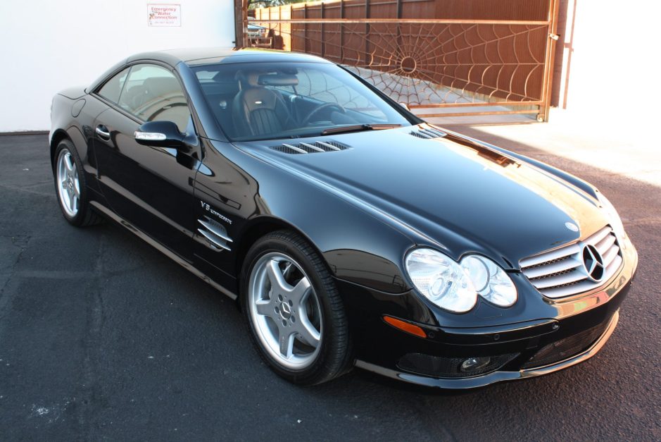 This 2003 Mercedes-Benz SL55 AMG is finished in black over charcoal leather and is powered by a supercharged 5.4-liter V8 paired with a five-speed automatic transmission. Equipment includes a retractable hardtop, 18″ AMG wheels, bi-xenon headlights, Active Body Control suspension, automatic climate control, Parktronic, Keyless-GO, power-adjustable and heated seats, and COMAND with navigation and Bose audio. It has under 16k miles, and recent service included an oil change.