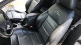 The seats are upholstered in Dark Charcoal leather with contrasting gray inserts. Body-colored switch bezels aLent the matching door panels and a serialized Saleen console plaque is mounted ahead of the shifter. Additional interior equipment includes air conditioning, cruise control, a Sony head unit, a Saleen close ratio shifter, and Saleen front sport seats.