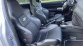 The cabin features heated front Konig seats trimmed in black leather with embroidered “R” logos along with a black dashboard, door panels, and carpets. Amenities include R-branded floor mats, automatic climate control, a leather shift knob and hand brake lever, brushed aluminum trim, a Euro-style headlight switch, and a CD/cassette stereo with a Monsoon sound system.