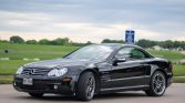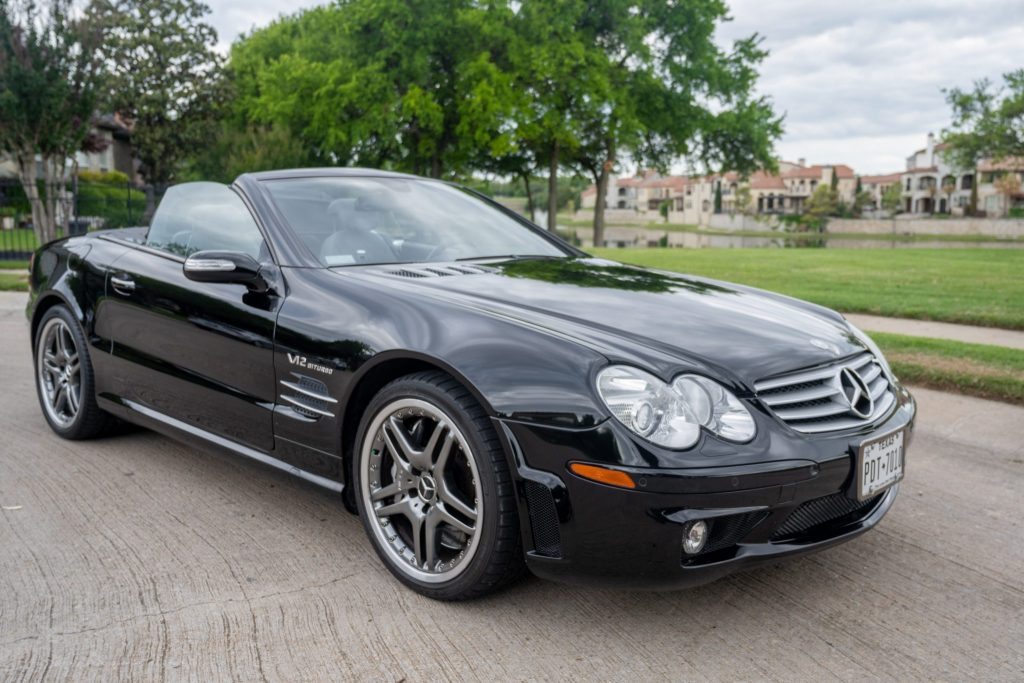 This 2005 Mercedes-Benz SL65 AMG is finished in black over Anthracite leather and powered by a twin-turbocharged 6.0-liter V12 paired with a five-speed AMG Speedshift automatic transmission. Equipment includes a power-retractable hardtop, the AMG Styling Package, a carbon-fiber engine cover, bi-xenon headlights, 19″ AMG double-spoke wheels, heated and ventilated multi-contour seats, and a premium sound system with a remote CD changer.