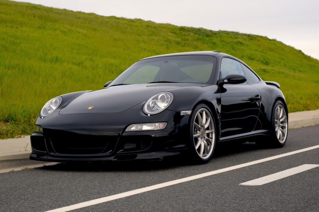 This 2005 Porsche 911 Carrera S coupe has 40k miles following registration history in California, and modifications include Fister Sports exhaust components, Bilstein coilovers, a Turbo-style rear wing, and an aerodynamic front bumper cover. The car is finished in black over matching leather, and it is powered by a 3.8-liter flat-six paired with a six-speed manual transaxle. Equipment includes the Sport Chrono Package Plus, 19″ Carrera Sport wheels, bi-xenon headlights, a sunroof, and Porsche Communication Management with navigation as well as heated front seats, a Bose High End Sound Package, automatic climate control, and cruise control.
