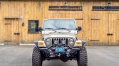 The body is finished in Light Khaki, and exterior equipment includes removable hard and soft tops, black fender flares and side mirrors, and a receiver hitch, while modifications consist of a 1″ body lift, a Smittybuilt XRC 8,000lb winch and bumpers with KC driving lights up front, and A to Z Fabrication rocker guards with tube step rails. The seller notes that a roof rack is also included in the sale. Scratches and a paint chip are visible on the front grille.