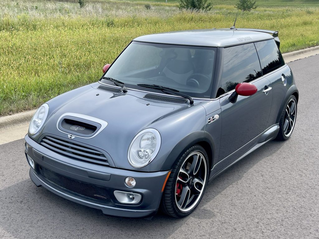 This 2006 Mini Cooper S John Cooper Works GP is one of 2,000 examples produced during a single-year production run and was delivered new to Mini of Saint Louis, Missouri. The car is finished Thunder Blue Metallic over two-tone black and gray and is powered by a supercharged 1.6-liter inline-four mated to a six-speed manual transaxle with a limited-slip differential. Equipment includes an aerodynamic body kit with a carbon-fiber rear wing, a sport exhaust system, 18″ wheels, heated seats, air conditioning, an Alpine stereo, and a rear strut-tower brace. The car was acquired by the seller in June 2021, and servicing in the past year is said to have included replacing the power steering pump, spark plugs, and tires.