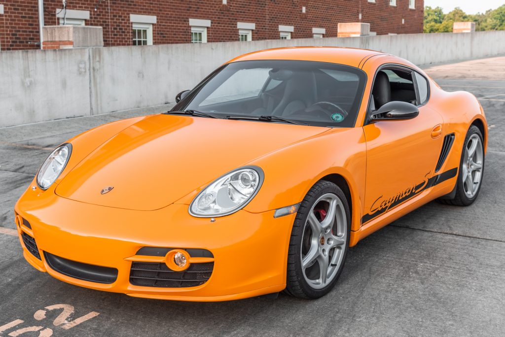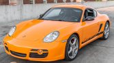 This 2006 Porsche Cayman S is powered by a 3.4-liter flat-six paired with a six-speed manual transaxle and has been modified with a GT3 shifter and a 90mm Remus Street cat-back exhaust. The car is finished in Arctic Silver Metallic and wears a Gloss Orange vinyl wrap over a black leather interior. Equipment includes 19″ Carrera S wheels, xenon headlights with washers, heated seats, automatic climate control, tinted windows, the Sport Chrono Package, and a Bose Surround…