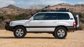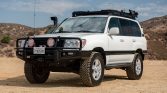 This 2006 Toyota Land Cruiser is finished in white over beige and is powered by a 4.7-liter V8 paired with a five-speed automatic transmission, a dual-range transfer case, and a locking center differential. Equipment includes a sunroof, an aftermarket roof rack, an ARB front bumper with a Warn winch, a Slee rear bumper and tire carrier, Slee rock sliders, a dual battery system, aftermarket LED fog and roof lights, ARB front and rear air lockers, heated front seats, and a Pioneer AM/FM/CD stereo and navigation system.