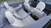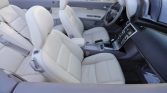 The cabin features seats upholstered in cream leather with matching door panel inserts and tan carpets. Equipment includes heated and power-adjustable seats with memory, automatic climate control, cruise control, premium audio, a wind deflector, and power windows, locks, and mirrors.