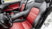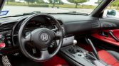 The cabin features seats upholstered in black and red leather with matching door panels along with red carpets and a black dashboard and roll hoops. Equipment includes aluminum pedals, cruise control, power aLessories, air conditioning, a locking center glovebox, and an aftermarket Pioneer CD stereo hidden behind a door in the center stack. The seller notes that an S2000 CR shift knob has been installed, and the factory CD stereo is included in the sale.