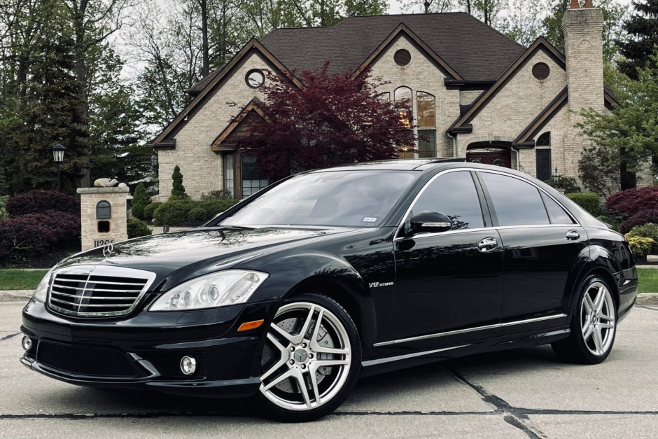 This 2007 Mercedes-Benz S65 AMG is finished in black over black Exclusive leather and is powered by a twin-turbocharged 6.0-liter V12 paired with a five-speed automatic transmission. Equipment includes bi-xenon headlamps with Active Curvelight, a panoramic sunroof, a power soft-closing trunk lid and doors, Keyless-Go, Distronic Plus cruise control, dynamic front seats, multi-contour individual rear seats, power rear window blinds, COMAND infotainment with navigation, and Harman Kardon audio.
