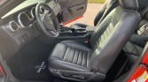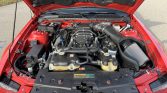 Black-finished and staggered-width 20″ Black Mamba-style alloy wheels are mounted with 255/35 front and 295/35 rear Nitto Invo tires. Stopping power is provided by four-wheel disc brakes with black-finished Brembo front calipers, and the suspension is modified with Ford Performance lowering springs and BMR Suspension rear components. A clear protective paint film is applied to the front bumper, fenders, and hood.