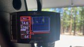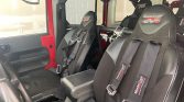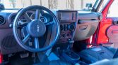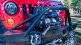 Forged 17″ American Racing ATX wheels wear Mickey Thompson Baja MTZ 37×12.5″ tires, and a matching spare is mounted on a Poison Spyder swing-out carrier at the rear along with a Hi-Lift jack. The truck has been lifted using a 4.5″ long-arm kit from Rubicon Express, and additional suspension modifications include JKS Manufacturing coil spacers, FOA gas shocks, adjustable front and rear track bars, and quick-disconnect pins for the sway bars. A Synergy heavy duty drag link and tie rod kit has also been installed along with a steering stabilizer relocation bracket and a FOX steering stabilizer shock.