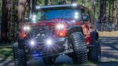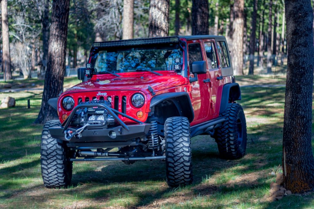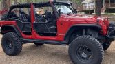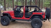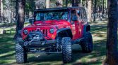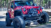 The truck is finished in Flame Red and has been fitted with Poison Spyder front and rear bumpers with a Warn winch and air compressor up front, Smittybilt XRC rock sliders, Poison Spyder differential covers, and GenRight aluminum-tube fender flares treated with black Armacoat. Lighting upgrades include JW Speaker LED headlights and tail lights as well as a Rigid Off Road Pro-series floodlight bar, driving lights, reverse lights, and a pair of LED light cubes mounted to each A-pillar. The Carfax report lists damage oLurring to the rear in August 2010, with no further information provided.