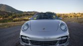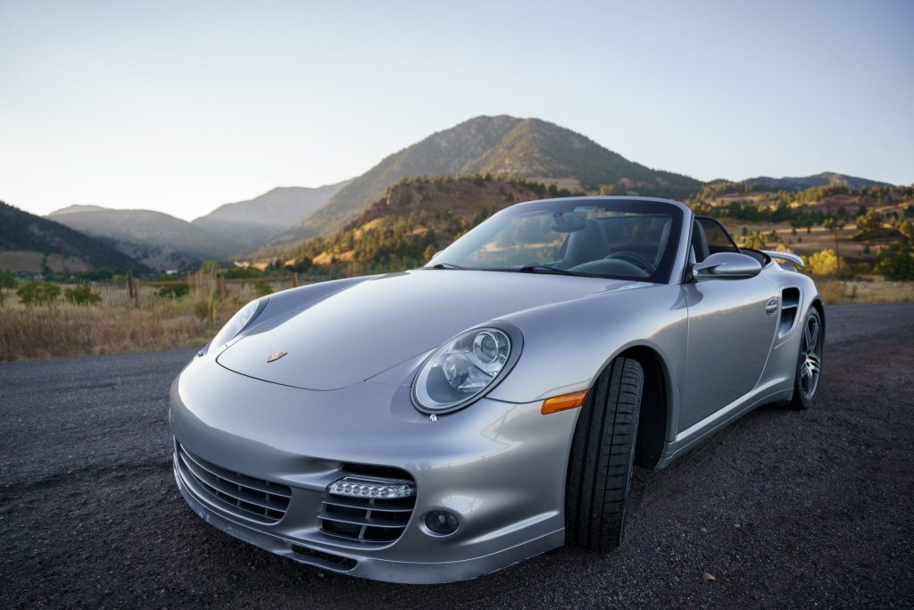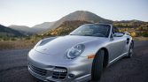 This 2009 Porsche 911 Turbo cabriolet is finished in GT Silver Metallic with a black convertible top over black leather and is powered by a twin-turbocharged 3.6L flat-six driving all four wheels through a six-speed manual transaxle. Equipment includes a body-color removable hardtop, 19” wheels, fog lights, Porsche Ceramic Composite Brakes, the Sport Chrono Package Turbo, a Bose sound system, and heated and adaptable front sport seats.