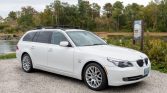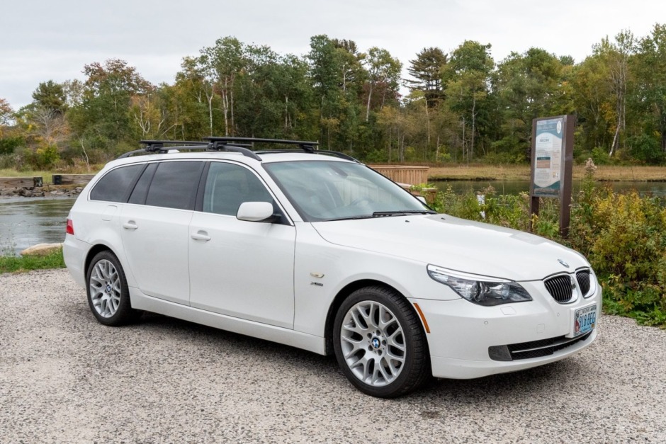 This 2010 BMW 535i xDrive Sports Wagon is powered by a twin-turbocharged 3.0-liter inline-six driving all four wheels through a six-speed manual transmission. Finished in Alpine White over black leather, it is equipped with 18” Style 197 wheels, bi-xenon headlamps, a panoramic sunroof, a roof rack, dual-zone automatic climate control, heated front seats, and iDrive infotainment with navigation. Modifications include an aftermarket intake and charge pipe, a dual-row radiator, a JB4 performance tuner, and a TiAL Sport bypass valve.