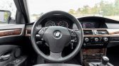 The cabin features power-adjustable and heated front seats upholstered in black Dakota leather with a matching dashboard, door panels, and carpets. Wood veneer trim accents the dashboard, center stack, and shifter surround, and additional appointments includes dual-zone automatic climate control, an M-branded shift knob, cruise control, a factory CD stereo, and an iDrive infotainment system with navigation.