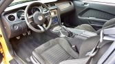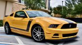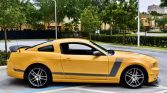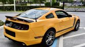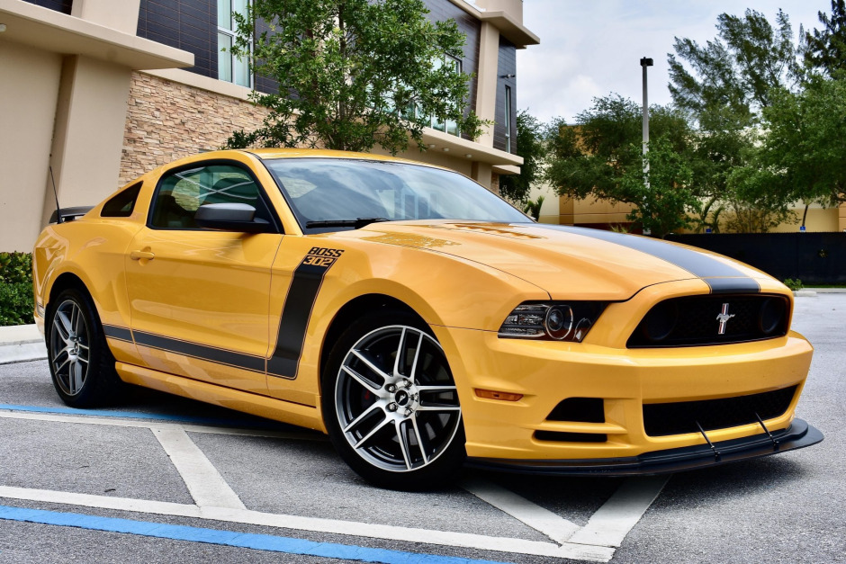 The car is finished in School Bus Yellow a black hood stripe, “hockey stick” side decals, Boss 302 logos, and black mirror caps. Additional equipment includes HID headlights, a rear wing, a front splitter, and a Laguna Seca-specific rear badge with a track outline. Scratches on the front splitter and paint chips on the front bumper cover are shown up close in the image gallery below.
