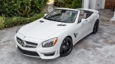 This 2013 Mercedes-Benz SL63 AMG is finished in Diamond White Metallic over beige Premium leather and powered by a twin-turbocharged 5.5-liter V8 paired with a seven-speed automatic transmission and a limited-slip differential. Additional equipment includes 19″ AMG double-spoke wheels, bi-xenon headlights with Active Curve Illumination, active ventilated multicontour seats, an Airscarf system, Keyless-Go, Distronic Plus, a Magic Sky Control panoramic roof panel, carbon-fiber interior trim, and a Harman Kardon sound system.