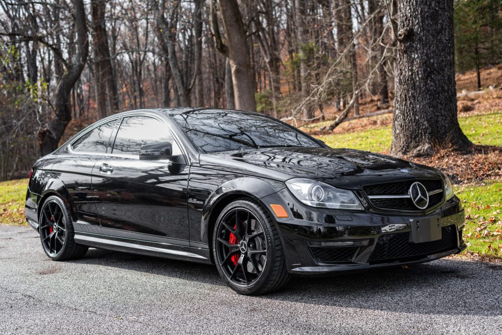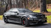 This 2014 Mercedes-Benz C63 AMG Edition 507 coupe is powered by a 6.2-liter M156 V8 paired with a seven-speed AMG Speedshift MCT automatic transmission and it has 14k miles. Edition 507-specific equipment includes upgraded engine components, re-mapped engine management software, and a vented aluminum hood, and the car is finished in Obsidian Black Metallic over black and Porcelain upholstery. It also has a limited-slip differential, black 19″ forged alloy wheels, bi-xenon headlights with washers, Parktronic, heated power-adjustable front seats, the Driver Assistance Package, a panoramic sunroof, Keyless-Go, COMAND infotainment, navigation, a rearview camera, and dual-zone automatic climate control.