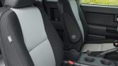 The cabin features front bucket seats and a rear bench upholstered in two-tone black and gray water-resistant fabric. Matte silver trim accents the dashboard. Other equipment includes an auto-dimming mirror, a CD stereo, air conditioning, and an Ultimate Edition dash plaque.