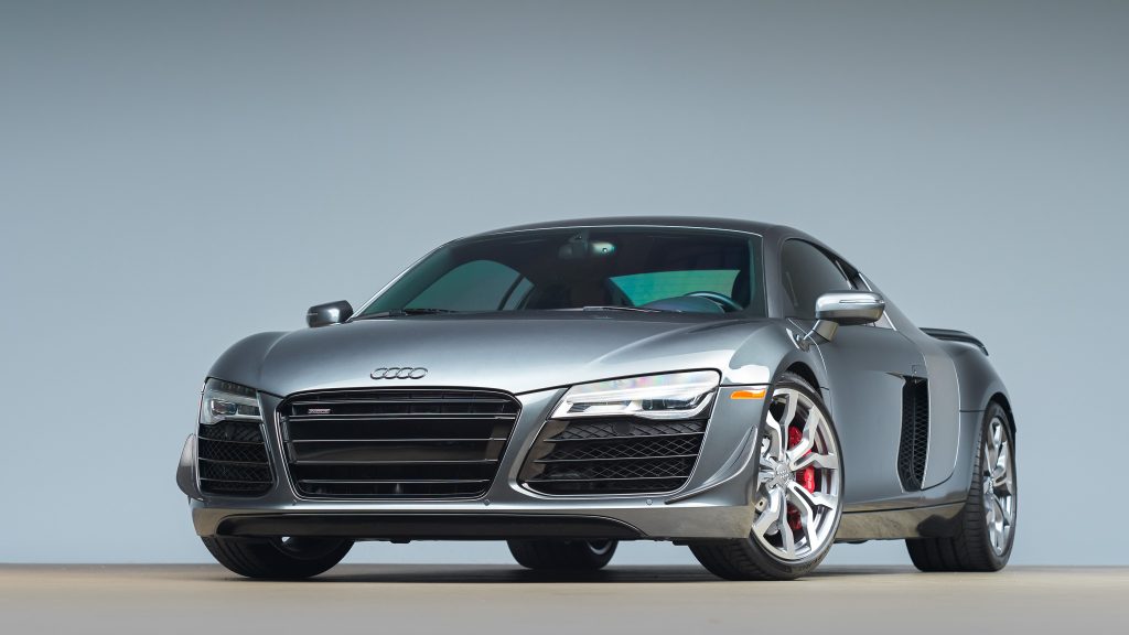 This 2015 Audi R8 coupe is finished in Daytona Gray Pearl over black Nappa leather and is powered by a 4.2-liter V8 paired with a seven-speed S-tronic dual-clutch automatic transaxle and a Quattro all-wheel-drive system. Additional equipment includes 19” Y-design wheels, magnetic-ride adaptive suspension, Carbon Sigma sideblades and interior inlays, a carbon-fiber rear wing and front canards, an aftermarket exhaust system, Audi MMI Navigation Plus, a Bang & Olufsen sound system, and heated front seats.