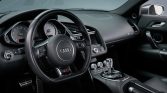 The cabin is trimmed in black Nappa leather with deviated red stitching, while Carbon Sigma inlays accent the center console and door panels. Amenities include Audi MMI Navigation Plus, a Bang & Olufsen sound system, automatic climate control, cruise control, and power-adjustable heated seats.