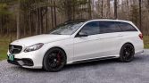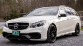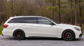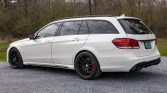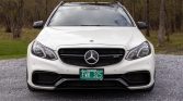 This 2015 Mercedes-AMG E63 S 4MATIC is provided by a twin-turbocharged 5.5-liter V8 paired with a seven-speed automatic transmission and 4MATIC all-wheel drive, and the car is finished in Diamond White over black Nappa leather. Equipment includes AMG Exterior Night Styling, black-finish 19″ HRE wheels, red-finished brake calipers, a panoramic sunroof, a hard-wired Valentine One radar detector, the Driver Assistance and Parking Assist packages, power-adjustable multi-contour front seats with memory, and COMAND infotainment with navigation and a Harmon Kardon surround-sound system.