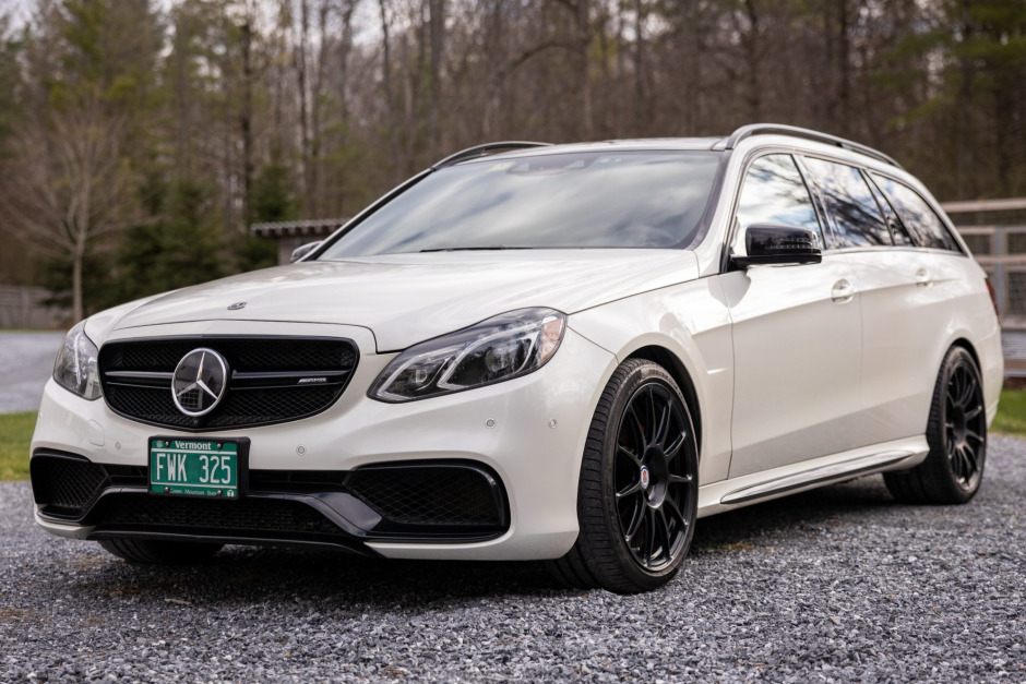 This 2015 Mercedes-AMG E63 S 4MATIC is provided by a twin-turbocharged 5.5-liter V8 paired with a seven-speed automatic transmission and 4MATIC all-wheel drive, and the car is finished in Diamond White over black Nappa leather. Equipment includes AMG Exterior Night Styling, black-finish 19″ HRE wheels, red-finished brake calipers, a panoramic sunroof, a hard-wired Valentine One radar detector, the Driver Assistance and Parking Assist packages, power-adjustable multi-contour front seats with memory, and COMAND infotainment with navigation and a…