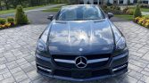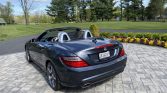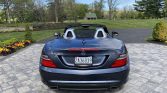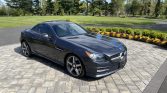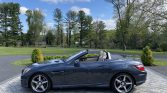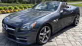 This 2015 Mercedes-Benz SLK250 convertible is finished in gray over beige MB-Tex and powered by a turbocharged 1.8-liter inline-four paired with a six-speed manual transmission. Equipment includes the AMG Styling Package, 18″ AMG five-spoke wheels, a power-retractable hardtop, LED running lights, sport suspension, power-adjustable and heated seats with Airscarf, and a Harman Kardon sound system.
