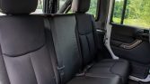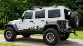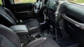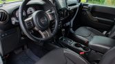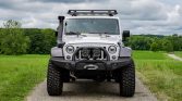 Satin-finished 17″ Borah wheels wear 37″ BFGoodrich Mud-Terrain T/A KM2 tires. A matching spare wheel is mounted on the swing-out spare tire carrier. The suspension features an AEV 4.5″ DualSport RS Suspension kit with Bilstein shocks, and braking is handled by a four-wheel disc system with ABS. An AEV front skid plate and differential covers are fitted.