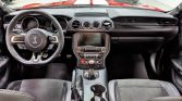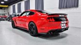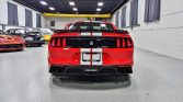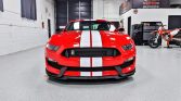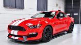 The body is finished in Race Red with optional white over-the-top racing stripes. GT350 features include front and rear spoilers, functional hood and fender vents, flared fenders, and quad exhaust outlets.