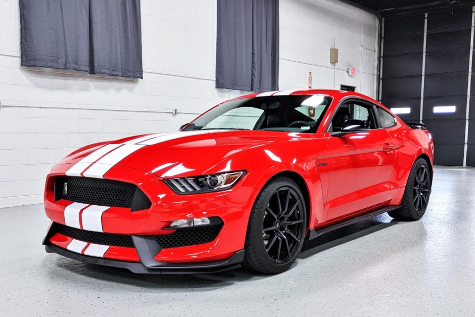 This 2018 Ford Mustang Shelby GT350 coupe is finished in Race Red over Ebony leather and microsuede, and it is powered by a 5.2-liter Voodoo V8 paired with a six-speed manual transmission. Features include a Torsen limited-slip differential, over-the-top racing stripes, and the Convenience Package, which adds navigation, dual-zone automatic climate control, and heated and ventilated front seats. The car was first delivered to Bommarito Ford in Hazelwood, Missouri, and it was acquired by the current owner in April 2021.