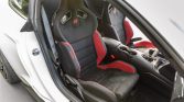 The cabin features Recaro sport seats trimmed in Ebony cloth and Miko suede with red accents and “R” embroidery on the backrests, while exposed carbon-fiber trim accents the dashboard. The rear seat is omitted on R models, and equipment includes a 12-speaker Bang & Olufsen sound system, a touchscreen infotainment system with voice-activated navigation, blind-spot monitoring (BLIS), a rearview camera, dual-zone automatic climate control, and cruise control.
