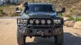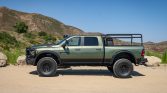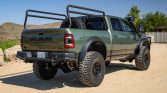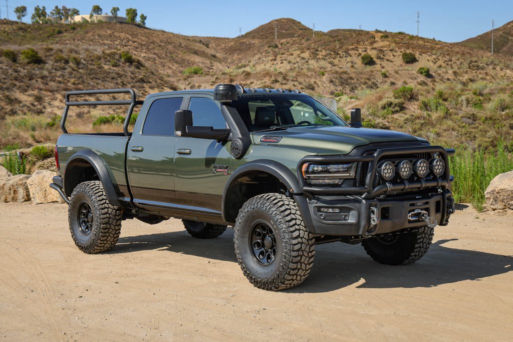 This 2022 Ram 2500 Power Wagon has been fitted with the American Expedition Vehicles (AEV) Prospector XL package, and it is powered by a 6.4-liter Hemi V8 linked with an eight-speed automatic transmission, a dual-range transfer case, and Tru-Lok front and rear differentials with revised gearing. The truck is finished in Olive Green Pearl-Coat and has a lifted suspension, Bilstein shocks, 17″ wheels, and 40″ tires along with heavy-duty bumpers, high-clearance fender flares, an air intake snorkel, a front brush guard, a bed rack, LED auxiliary lights, and a WARN winch. Other features include a surround-view camera system, Harman Kardon audio, Uconnect infotainment, and heated and ventilated front seats trimmed in black leather.