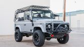 The Osprey OC90 is manufactured in the style of an NAS Defender 90 using a combination of factory and rebuilt Land Rover parts as well as varios aftermarket components. The aluminum body panels on this example are finished in Khaki Grey and are mounted to a galvanized chassis. The external roll cage, roof rack, front bull bar, NAS-style rear bumper, and rock sliders are powder-coated black, and the LED exterior lights wear tinted lenses. Additional equipment includes a Warn electric winch, body-color wheel arch extensions, aluminum door hardware, and an integrated receiver hitch.