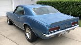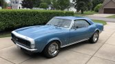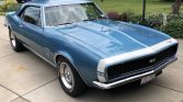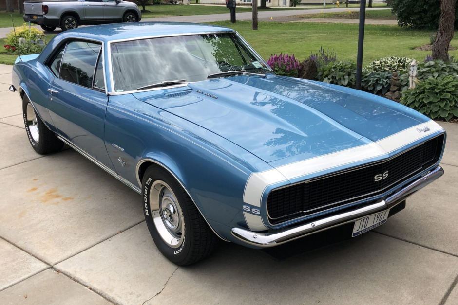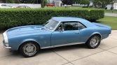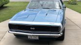 This 1967 Chevrolet Camaro RS/SS is finished in Marina Blue with a white front accent stripe over black vinyl and is powered by a replacement 355ci V8 paired with a Tremec TKO 600 five-speed manual transmission and positraction rear axle. Equipment includes the Rally Sport equipment package, Interior Decor package, tinted windows, a dual exhaust system, bucket seats, air conditioning, a center console, a 1969 model cowl hood, power steering, front disc brakes, and an AM/FM/cassette stereo. The car is said to have been purchased in 1979 from the previous owner in Florida and subsequently refurbished in the late-1990s.