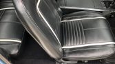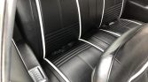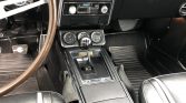 The cabin features front bucket seats and a rear bench trimmed in black vinyl with matching door panels that are complemented by a black dashboard, console, and carpeting. Additional interior appointments include a center console, lap belts, power windows, a Hurst shifter, black rubber floor mats, and an AM/FM/cassette stereo.